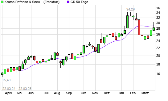 Mit dem Rücksetzer auf 28,37 EUR hat die Kratos Defense & Security Solutions-Aktie am 21.03.2025 die 50-Tage-Linie nach unten gekreuzt.