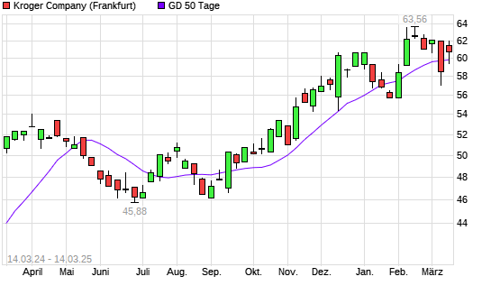 Mit dem Rücksetzer auf 59,43 EUR hat die Kroger Company-Aktie am 13.03.2025 die 50-Tage-Linie nach unten gekreuzt.
