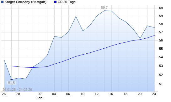 Mit dem Rücksetzer auf 55,90 EUR hat die Kroger Company-Aktie am 23.02.2026 die 20-Tage-Linie nach unten gekreuzt.Die Kroger Company-Aktie befindet sich seit dem 20.02.2026 ...weiterlesen