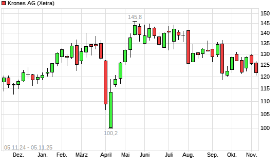 Mit dem Rücksetzer auf 121,20 EUR hat die Krones-Aktie (ISIN DE0006335003) am 04.11.2025 ein neues 6-Monats-Tief erreicht und damit den Kurs vom 22.09.2025 eingestellt.