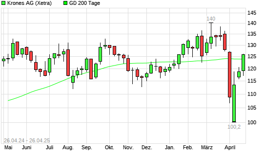 Mit dem Anstieg auf 123,80 EUR hat die Krones-Aktie am 25.04.2025 die 200-Tage-Linie nach oben gekreuzt.