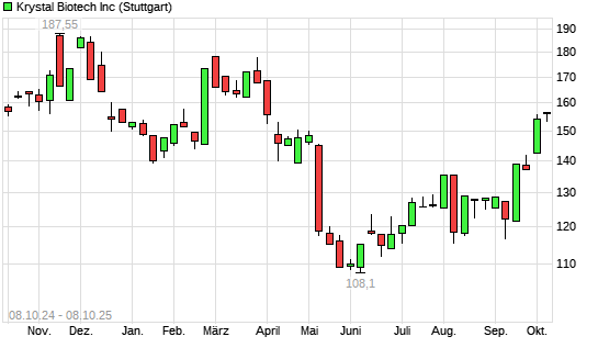 Mit dem Anstieg auf 155,90 EUR hat die Krystal Biotech-Aktie (ISIN US5011471027) am 07.10.2025 ein neues 6-Monats-Hoch erreicht und damit den Kurs vom 03.10.2025 eingestellt.