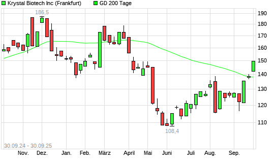 Mit dem Anstieg auf 142,50 EUR hat die Krystal Biotech-Aktie am 29.09.2025 die 200-Tage-Linie nach oben gekreuzt.