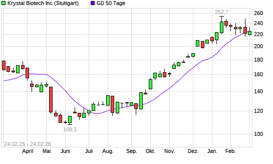 Mit dem Anstieg auf 231,90 EUR hat die Krystal Biotech-Aktie am 23.02.2026 die 50-Tage-Linie nach oben gekreuzt.