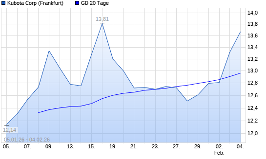 Mit dem Anstieg auf 13,31 EUR hat die Kubota-Aktie am 03.02.2026 die 20-Tage-Linie nach oben gekreuzt.