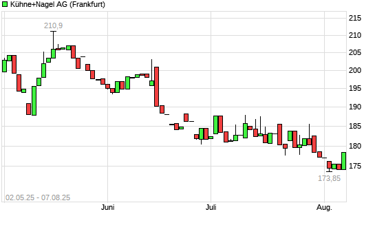 Mit dem Rücksetzer auf 174,20 EUR hat die Kühne + Nagel-Aktie (ISIN CH0025238863) am 06.08.2025 ein neues 3-Jahres-Tief erreicht und damit den Kurs vom 04.08.2025 eingestellt.