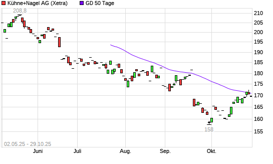 Mit dem Rücksetzer auf 168,60 EUR hat die Kühne + Nagel-Aktie am 28.10.2025 die 50-Tage-Linie nach unten gekreuzt.
