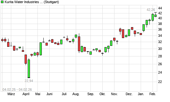 Mit dem Anstieg auf 42,14 EUR hat die Kurita Water Industries-Aktie (ISIN JP3270000007) am 03.02.2026 ein neues 12-Monats-Hoch erreicht und damit den Kurs vom 30.01.2026 eingestellt.