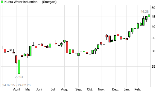 Mit dem Anstieg auf 45,52 EUR hat die Kurita Water Industries-Aktie (ISIN JP3270000007) am 23.02.2026 ein neues 3-Jahres-Hoch erreicht und damit den Kurs vom 12.02.2026 eingestellt.