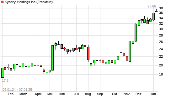 Mit dem Anstieg auf 37,66 EUR hat die Kyndryl Holdings-Aktie (ISIN US50155Q1004) am 06.01.2025 ein neues All-Time-High erreicht und damit den Kurs vom 03.01.2025 eingestellt.