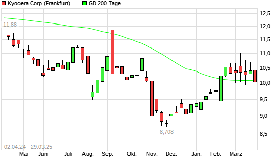 Mit dem Rücksetzer auf 10,04 EUR hat die Kyocera-Aktie am 28.03.2025 die 200-Tage-Linie nach unten gekreuzt.