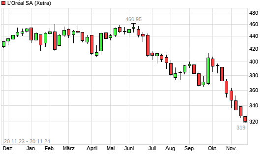 Mit dem Rücksetzer auf 321,55 EUR hat die L'Oréal-Aktie (ISIN FR0000120321) am 19.11.2024 ein neues 12-Monats-Tief erreicht und damit den Kurs vom 18.11.2024 eingestellt.