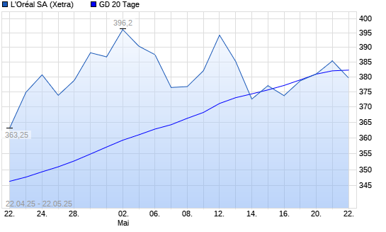 Mit dem Anstieg auf 385,50 EUR hat die L´Oréal-Aktie am 21.05.2025 die 20-Tage-Linie nach oben gekreuzt.
