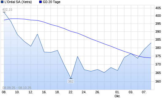Mit dem Anstieg auf 378,10 EUR hat die L´Oréal-Aktie am 07.10.2025 die 20-Tage-Linie nach oben gekreuzt.
