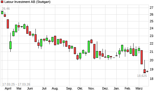 Mit dem Rücksetzer auf 18,76 EUR hat die LATOUR INV. B-Aktie (ISIN SE0010100958) am 16.03.2026 ein neues 12-Monats-Tief erreicht und damit den Kurs vom 09.03.2026 eingestellt.