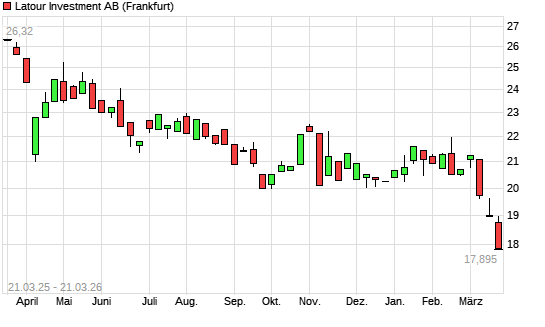 Mit dem Rücksetzer auf 17,90 EUR hat die LATOUR INV. B-Aktie (ISIN SE0010100958) am 20.03.2026 ein neues 12-Monats-Tief erreicht und damit den Kurs vom 19.03.2026 eingestellt.