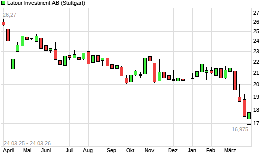 Mit dem Rücksetzer auf 17,26 EUR hat die LATOUR INV. B-Aktie (ISIN SE0010100958) am 23.03.2026 ein neues 12-Monats-Tief erreicht und damit den Kurs vom 20.03.2026 eingestellt.