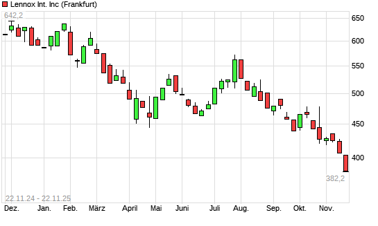 Mit dem Rücksetzer auf 382,20 EUR hat die LENNOX International-Aktie (ISIN US5261071071) am 21.11.2025 ein neues 12-Monats-Tief erreicht und damit den Kurs vom 19.11.2025 eingestellt.