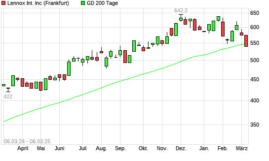 Mit dem Rücksetzer auf 540,00 EUR hat die LENNOX International-Aktie am 05.03.2025 die 200-Tage-Linie nach unten gekreuzt. ##trendBox## Die LENNOX International-Aktie befindet sich jetzt ...weiterlesen