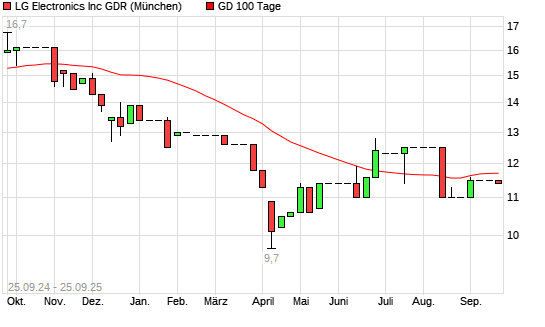 Mit dem Anstieg auf 11,50 EUR hat die LG Electronics GDR-Aktie am 24.09.2025 die 100-Tage-Linie nach oben gekreuzt.