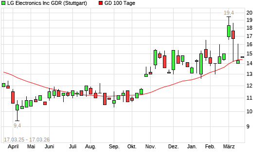Mit dem Anstieg auf 14,60 EUR hat die LG Electronics GDR-Aktie am 16.03.2026 die 100-Tage-Linie nach oben gekreuzt.