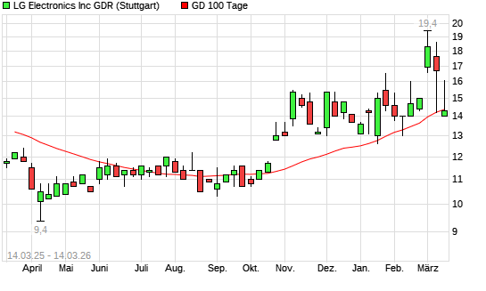 Mit dem Rücksetzer auf 14,20 EUR hat die LG Electronics GDR-Aktie am 13.03.2026 die 100-Tage-Linie nach unten gekreuzt.