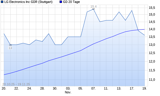 Mit dem Rücksetzer auf 13,80 EUR hat die LG Electronics GDR-Aktie am 18.11.2025 die 20-Tage-Linie nach unten gekreuzt.