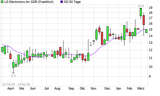 Mit dem Rücksetzer auf 14,50 EUR hat die LG Electronics GDR-Aktie am 09.03.2026 die 50-Tage-Linie nach unten gekreuzt.