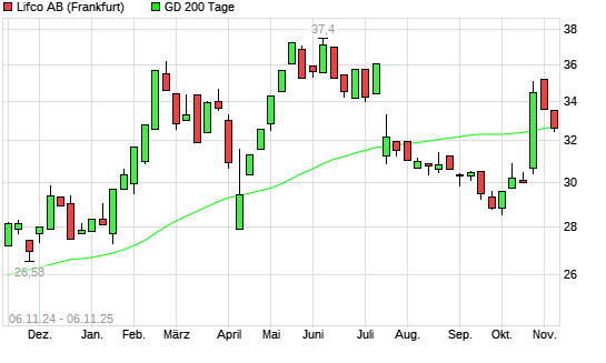 Mit dem Rücksetzer auf 32,48 EUR hat die LIFCO AB B-Aktie am 05.11.2025 die 200-Tage-Linie nach unten gekreuzt.