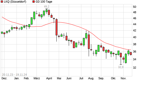 Mit dem Rücksetzer auf 36,20 EUR hat die LKQ-Aktie am 18.11.2024 die 100-Tage-Linie nach unten gekreuzt.