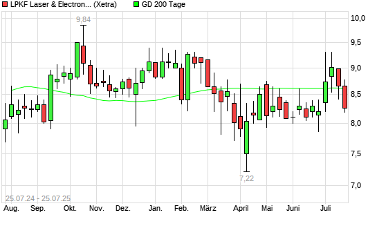 Mit dem Rücksetzer auf 8,45 EUR hat die LPKF Laser-Aktie am 24.07.2025 die 200-Tage-Linie nach unten gekreuzt.Die LPKF Laser-Aktie befand sich seit dem 23.07.2025 im langfristigen Aufwärtstrend ...weiterlesen