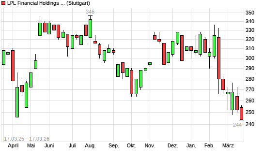 Mit dem Rücksetzer auf 248,00 EUR hat die LPL FINANCIAL HLDS-Aktie (ISIN US50212V1008) am 16.03.2026 ein neues 6-Monats-Tief erreicht und damit den Kurs vom 13.03.2026 eingestellt.