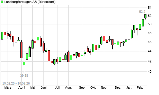 Mit dem Anstieg auf 51,70 EUR hat die LUNDBERGF. B FRIA-Aktie (ISIN SE0000108847) am 09.02.2026 ein neues 12-Monats-Hoch erreicht und damit den Kurs vom 06.02.2026 eingestellt.