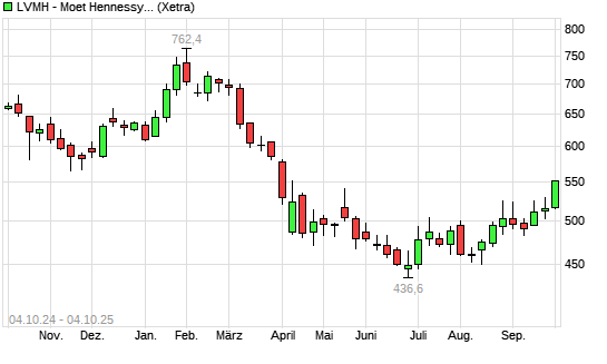 Mit dem Anstieg auf 550,00 EUR hat die LVMH Moët Hennessy Louis Vuitton-Aktie (ISIN FR0000121014) am 03.10.2025 ein neues 6-Monats-Hoch erreicht und damit den Kurs vom 03.04.2025 eingestellt.