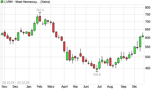 Mit dem Anstieg auf 622,50 EUR hat die LVMH Moët Hennessy Louis Vuitton-Aktie (ISIN FR0000121014) am 23.10.2025 ein neues 6-Monats-Hoch erreicht und damit den Kurs vom 22.10.2025 eingestellt.