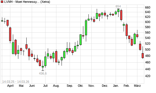Mit dem Rücksetzer auf 479,60 EUR hat die LVMH Moët Hennessy Louis Vuitton-Aktie (ISIN FR0000121014) am 13.03.2026 ein neues 6-Monats-Tief erreicht und damit den Kurs vom 12.03.2026 eingestellt.