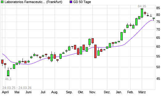Mit dem Rücksetzer auf 75,85 EUR hat die Laboratorios Farmaceut.-Aktie am 23.03.2026 die 50-Tage-Linie nach unten gekreuzt.