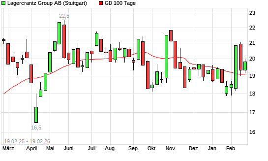 Mit dem Anstieg auf 19,46 EUR hat die Lagercrantz Group-Aktie am 18.02.2026 die 100-Tage-Linie nach oben gekreuzt.Die Lagercrantz Group-Aktie befindet sich seit dem 12.02.2026 ...weiterlesen