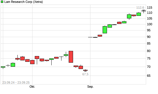 Mit dem Anstieg auf 111,60 EUR hat die Lam Research-Aktie (ISIN US5128073062) am 22.09.2025 ein neues All-Time-High erreicht und damit den Kurs vom 18.09.2025 eingestellt.