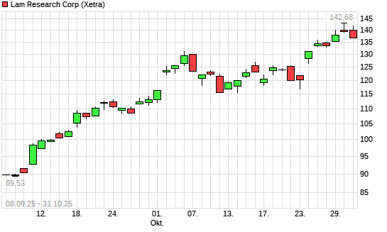Mit dem Anstieg auf 139,88 EUR hat die Lam Research-Aktie (ISIN US5128073062) am 30.10.2025 ein neues All-Time-High erreicht und damit den Kurs vom 29.10.2025 eingestellt.
