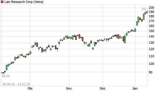 Mit dem Anstieg auf 190,30 EUR hat die Lam Research-Aktie (ISIN US5128073062) am 12.01.2026 ein neues All-Time-High erreicht und damit den Kurs vom 09.01.2026 eingestellt.