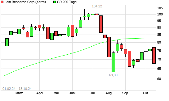 Die Lam Research-Aktie befand sich seit dem 23.01.2025 im langfristigen Abwärtstrend und hat in diesem Zeitraum +2,47% an Wert gewonnen.