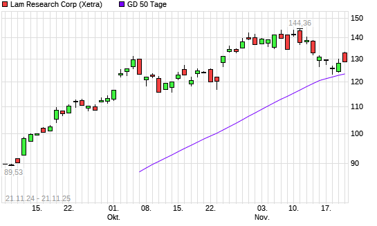 Mit dem Rücksetzer auf 121,50 EUR hat die Lam Research-Aktie am 20.11.2025 die 50-Tage-Linie nach unten gekreuzt.