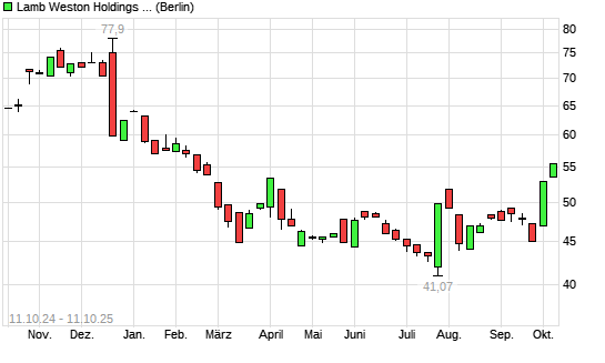 Mit dem Anstieg auf 55,56 EUR hat die Lamb Weston-Aktie (ISIN US5132721045) am 10.10.2025 ein neues 6-Monats-Hoch erreicht und damit den Kurs vom 09.10.2025 eingestellt.