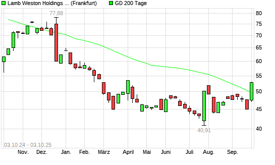 Mit dem Anstieg auf 53,02 EUR hat die Lamb Weston-Aktie am 02.10.2025 die 200-Tage-Linie nach oben gekreuzt.