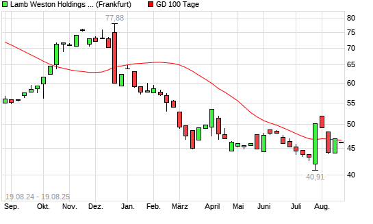 Mit dem Rücksetzer auf 46,08 EUR hat die Lamb Weston-Aktie am 18.08.2025 die 100-Tage-Linie nach unten gekreuzt.