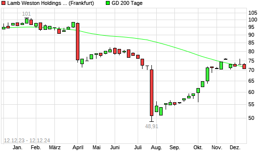 Mit dem Rücksetzer auf 71,66 EUR hat die Lamb Weston-Aktie am 11.12.2024 die 200-Tage-Linie nach unten gekreuzt.