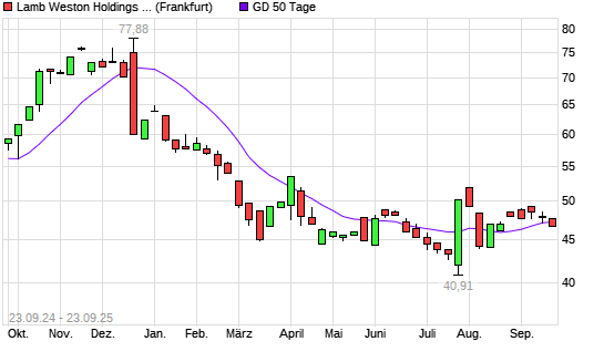 Mit dem Rücksetzer auf 46,67 EUR hat die Lamb Weston-Aktie am 22.09.2025 die 50-Tage-Linie nach unten gekreuzt.