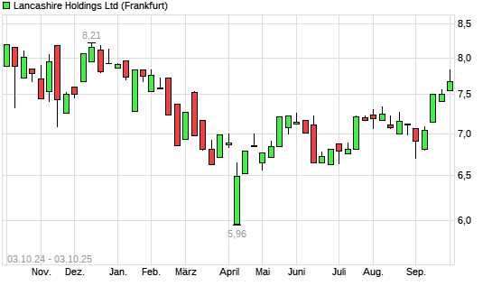 Mit dem Anstieg auf 7,85 EUR hat die Lancashire Holdings-Aktie (ISIN BMG5361W1047) am 02.10.2025 ein neues 6-Monats-Hoch erreicht und damit den Kurs vom 01.10.2025 eingestellt.