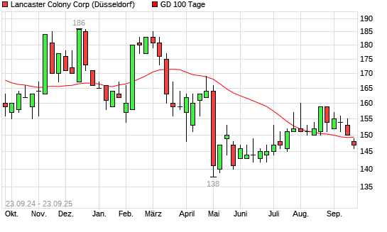 Mit dem Rücksetzer auf 149,00 EUR hat die Lancaster Colony-Aktie am 22.09.2025 die 100-Tage-Linie nach unten gekreuzt.
